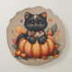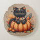 Black Cat on Pumpkin with Autumn Quilt Pattern Round Cushion