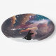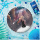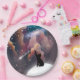 This outer space illustration seems a bit surreal with clouds in blue, pink, purple and yellow. A black cat sits on the moon gazing out at the stars with fascination as she reaches out to grab one in this funny feline cartoon that is sure to be appreciated by any black cat lover.