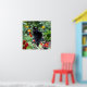 Black cat in a summer garden photography poster. Square art for the wall features a pretty, black kitty looking over her back towards the camera. She sits among red nasturtiums and orange marigolds in a flower and vegetable garden.