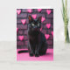 This card features a black cat sitting calmly in the center, looking straight at you with wide yellow-green eyes. Behind the cat is a deep purple wall filled with soft pink heart shapes that look slightly blurred, like a gentle glow in the background. The cat rests on a bright pink surface, and its tail curves neatly along the edge. You can see fine white whiskers, a small nose with a hint of pink, and alert ears with a light warm tint inside. There isn’t any text printed on the front, so the sweet cat-and-hearts design does all the talking. The overall scene feels romantic and cozy, making it a nice choice for a partner or a close friend ❤️💌🍫. It’s a lovely way to share Valentine’s Day sentiments with someone you care about.
