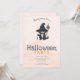 At the centre of the invitation is a cute black cat, adding a playful and whimsical touch to the design. The cat is depicted holding a witches broom and wearing a striped witches hat, adding to the festive and spooky theme of the invitation.