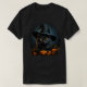 A black cat, calmly resting, wears a pointed witch's hat with small pumpkins around. The background features a large, eerie moon that enhances the Halloween setting.