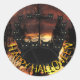 Black cats on patrol in a hauntingly beautiful sunset sky Halloween stickers. Their bright yellow eyes add a scary touch. Sunset photography used with permission from Steve Janizewski. Original cat photography and card design by Anura Design Studio.