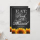 Eat Drink & Be Married Black Chalkboard Sunflower Wedding Invitations. Compliment your sunflower wedding theme with these invitations that feature a black chalkboard as a background with Eat, Drink & Be Married in elegant script with vibrant sunflowers at the bottom of the front and back of each invitation.