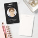 A Minimalist employee badge on a black background with a circle photo frame for company, small business, festival, press staff, etc. It comes with company name, employee's name, job or service on the front. On the back, you have a QR Code, 2 customisable text zones.