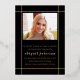 Modern gold foil and black Class of 2025 with photo graduation announcement. This photo Announcement is designed with a sleek and contemporary touch. The combination of black and gold foil creates a modern aesthetic, with the gold foil border elegantly framing the graduate's photo against a black background. The name and other important information are thoughtfully placed outside the frame, ensuring they stand out on the black background with their gold colour. On the back of the announcement, you will find the same stylish border along with another photo and all the essential details about the graduation. The cover has been designed using some assets from Freepik.com