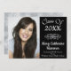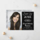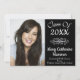 Announce your graduation with an elegant announcement. The grad's picture is set on the left side of the announcement. The right side is offset with a black background with trendy font set in white. A scrolled silver flourish with an image of a faux diamond completes the design. The back of the announcement is set with an coordinating bokeh background in shades of grey's.