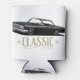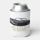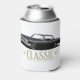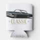 This is a rendering of a black American classic car with vintage style graphics in the background for a retro look.
