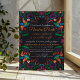 This Black Colorful Floral Nuestra Boda Spanish Wedding Invitation bold and vibrant design features a deep black background that highlights the vivid colors of the surrounding floral and bird motifs. The colorful elements include bright oranges, purples, greens, and blues, with swirling vines, flowers, and birds framing the central area, giving it a lively and festive appearance. The contrast between the dark background and the radiant colors creates a striking, dynamic visual perfect for a modern and unique wedding stationery design.