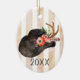 Keepsake ornament features a watercolor illustration of a black cowboy hat with Boho style antlers feathers and flower accessories on distressed pale striped background. Customise with year or other special text