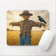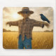 A black crow is sitting confidently on the arm of a scarecrow wearing ragged jeans, a straw hat, and a plaid shirt, right in a golden wheat field