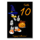 Black custom Happy Halloween table cards with wizard penguin, pumpkin and orange customisable text
