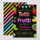 Amaze your guests with this colourful kids birthday party invite featuring assorted fruits and vibrant typography against a black background. Simply add your event details on this easy-to-use template to make it a one-of-a-kind invitation. Flip the card over to reveal a colourful stripes pattern on the back of the card.