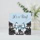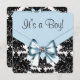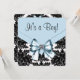 Black and white damask baby blue and black baby boy shower invitation. Add your details to the front and back of this elegant blue and black damask baby shower invitation by simply adding your event details, font style, font size & colour, and wording. Please note - all of the invitation designs you will find on Zazzle are printed graphics on flat paper stock with no actual jewels, bows, raised, embossed, or added parts or pieces.