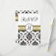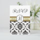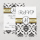 Elegant sophisticated Vintage Black and White Damask Wedding Invitation RSVP Cards with gold accent colour which you can personalise. A beautiful damask pattern background is accentuated with a circular embellishment and monogram on top of a metallic gold effect line containing the bride and groom names. Photoshop effects with shadows gives this card a 3D layered look printed directly on your choice of paper. Wedding Reply Card Design by Elke Clarke ©2010, 2012. Graphics licensed. An elegant way to set the theme of your wedding. Personalise with your wedding details and wedding response card information for the perfect wedding invitation collection.
