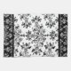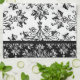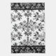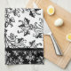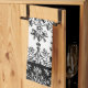 An elegant kitchen towel with a vintage daisy and leaf damask pattern in black on white with a border in white on black.