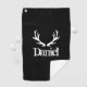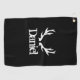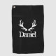 Black vintage deer antler logo custom name golfing gift Golf Towel. Personalized sports presents for him or her. Unique golfing gifts for men and women. Unique Birthday gift ideas for avid golfer, husband, dad, wife, mom, father, friend, co worker, boss, colleague, coach, instructor, trainer, teacher, grandpa, retired person, pensioner, golf lover, player, politician, tournament player etc. Includes hook to hang it up. Unique golf accessories for friends and family. Also great for Christmas or Father's Day. Rustic design with name or surname.