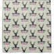 A shower curtain with a black deer head with large antlers. Geometric lines inside the face of the deer adds a creative touch. Colourful pink flowers and mint