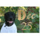 A design featuring a black lab type dog wearing a white tshirt and yellow coloured text reading Dec 25th against a grassy background. Original photograph (c) Susan L. Marsh.