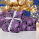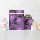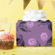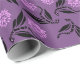 Based on a hexagon pattern, three black dragonfly facing inward spiral, offsetting them are purple flower. The design is done in a vector art style.