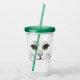 This acrylic drink tumbler with straw and lid has a black drawing of the face of a cat with long whiskers and bright green eyes on the front and back.