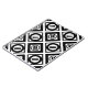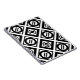 Bold geometric pattern features alternating thick and thin black diamonds with white space between them. The thick diamonds each contain a thin black circle with a thick equal sign at an angle inside. In contrast, the thin diamonds each contain a thick black circle that touches its edges with a thin tilted equal sign inside.