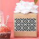 Bold geometric pattern features alternating thick and thin black diamonds with white space between them. The thick diamonds each contain a thin black circle with a thick equal sign at an angle inside. In contrast, the thin diamonds each contain a thick black circle that touches its edges with a thin tilted equal sign inside.