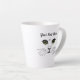 This Latte mug has a black etched drawing of a cat face with long whiskers and vibrant green eyes. Customise your text with the template.