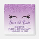 Save the date magnet with a trendy stylish design. The background is a purple gradient color with an image of faux sparkling glitter dripping down from the top. A pair of girly cute eyelashes underneath the glitter image.