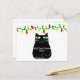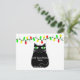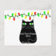 Black fat cartoon cat with green eyes. Cute cat character. Custom postcards for Christmas. White background. Edit text to customise. Gift idea for cat lovers.