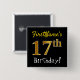 This simple square button design features a message like "FirstName’s 17th Birthday!", with the "17th" having a faux/imitation gold-like colouring look, on a black coloured background. The name can be customised. Buttons like these could perhaps be worn by guests at a birthday party for somebody who is celebrating their seventeenth birthday, where the party is being held in a large area with lots of other people present (such as a city park or a theme park). [~Z0000162]