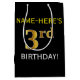 Black, Faux Gold 3rd Birthday + Custom Name Medium Gift Bag