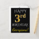 This simple, personalised birthday postcard design features the message "HAPPY 3rd BIRTHDAY", with the "3rd" having a faux gold-like appearance. The front also features a customised name, and a black background. The back features a customised birthday message, along with the customisable address of the birthday postcard recipient. It could be sent to somebody who is celebrating their third birthday. [~Z0000069]