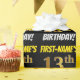 This wrapping paper design features a message like "FIRST-NAME’S 13th BIRTHDAY!", with the "13th" having a faux/imitation gold-like colour appearance, and with the name and "BIRTHDAY" in a fun, bold font. The name is customisable, and the background is coloured black. Wrapping paper like this could perhaps be used when wrapping birthday gifts being given to somebody in celebration of their thirteenth birthday. [~Z0000203]