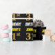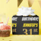 This wrapping paper design features a message like "JENNIFER’S 31st BIRTHDAY!", with the "31st" having a faux/imitation gold-like colour appearance, and with the name and "BIRTHDAY" in a fun, bold font. The name can be personalised, and the background is coloured black. Wrapping paper like this could perhaps be used when wrapping birthday gifts being given to somebody in celebration of their thirty first birthday. [~Z0000203]