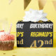 This wrapping paper design features a message like "REGINALD’S 42nd BIRTHDAY!", with the "42nd" having a faux/imitation gold-like colour appearance, and with the name and "BIRTHDAY" in a fun, bold font. The name can be personalised, and the background is coloured black. Wrapping paper like this could perhaps be used when wrapping birthday gifts being given to somebody in celebration of their forty second birthday. [~Z0000203]