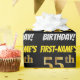 This wrapping paper design features a message like "FIRST-NAME’S 55th BIRTHDAY!", with the "55th" having a faux/imitation gold-like colour appearance, and with the name and "BIRTHDAY" in a fun, bold font. The name can be personalised, and the background is coloured black. Wrapping paper like this could perhaps be used when wrapping birthday gifts being given to somebody in celebration of their fifty fifth birthday. [~Z0000203]