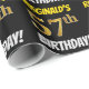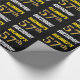 This wrapping paper design features a message like "REGINALD’S 57th BIRTHDAY!", with the "57th" having a faux/imitation gold-like colour appearance, and with the name and "BIRTHDAY" in a fun, bold font. The name can be personalised, and the background is coloured black. Wrapping paper like this could perhaps be used when wrapping birthday gifts being given to somebody in celebration of their fifty seventh birthday. [~Z0000203]