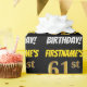 This wrapping paper design features a message like "FIRSTNAME’S 61st BIRTHDAY!", with the "61st" having a faux/imitation gold-like colour appearance, and with the name and "BIRTHDAY" in a fun, bold font. The name is customisable, and the background is coloured black. Wrapping paper like this could perhaps be used when wrapping birthday gifts being given to somebody in celebration of their sixty first birthday. [~Z0000203]