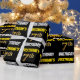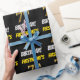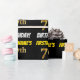 This wrapping paper design features a message like "FIRSTNAME’S 7th BIRTHDAY!", with the "7th" having a faux/imitation gold-like colour appearance, and with the name and "BIRTHDAY" in a fun, bold font. The name can be personalised, and the background is coloured black. Wrapping paper like this could perhaps be used when wrapping birthday gifts being given to somebody in celebration of their seventh birthday. [~Z0000203]