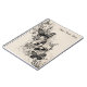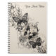 A white notebook with a diagonally placed design of black halftone butterflies with decorative flourishes and a lace-like motif.
