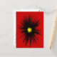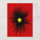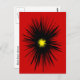 This postcard features a dramatic abstract design of a black flower with a golden yellow centre on a scarlet red background.