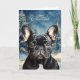 Rich, deep blues mix with soft golden shades and creamy tones of a winter pine forest to give a seasonal background for this cute black French Bulldog with Christmas greetings for dog lovers.