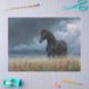 A black Friesian stallion standing tall in a field of windswept tan grass beneath a dramatic stormy sky—perfect for equine lovers, fantasy art fans, or anyone drawn to bold, majestic scenes full of atmosphere and strength.
