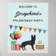 Destei's original cartoon illustration of an adorable black colour German Shepherd breed dog. The dog is placed in a colourful birthday setting. There is a birthday cake with some candles on it, colourful birthday balloons and a bunting banner as well as two present boxes.