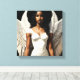 Canvas art features artwork of a beautiful melanated woman as a heavenly angel with large, white wings, wearing a white dress.