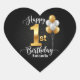 Seal envelopes or decorate party favors with this gorgeous sheet of personalized heart-shaped stickers, perfect for a baby's 1st birthday or shower. The design features a stunning faux gold number '1' and a festive cluster of metallic gold and white balloons against a sophisticated chalkboard black background. This sheet includes multiple customizable stickers for gift tags, thank you notes, or envelope seals.