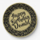 This over-the-hill design has a black and gold random number pattern with a gold milestone number 85 repeated in varied sizes and angles over a black background. There is a gold circle in the centre for your text and black and gold rings around the rim.