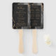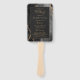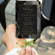 This elegant, modern wedding program fan features a black agate background trimmed with gold faux glitter. The text appears in elegant gold coloured handwriting and copperplate fonts on an off-black rectangle.