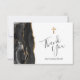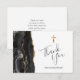 This elegant modern First Communion thank you card features a black watercolor agate border trimmed with gold faux glitter. A small gold faux foil cross appears over the words "Thank You" in charcoal grey handwriting script on a white background. The customisable text includes your child's name on the front and an editable message on the back in italics.